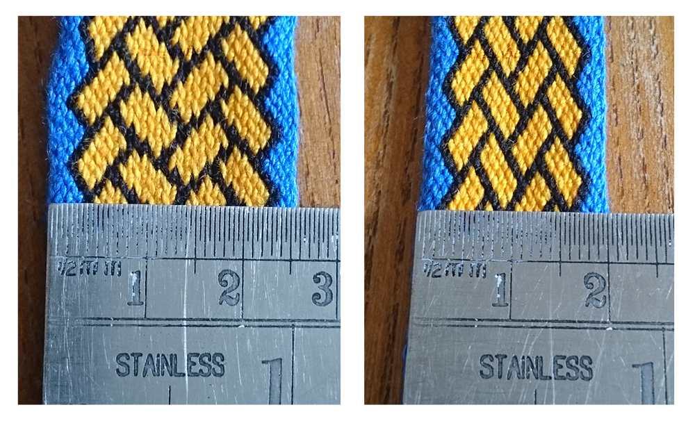 Working to a wider width (looser weft) gives less well defined outlines within the design. When looking at the belt/strap from a distance, this isn’t an issue. The fabric of the band is also more pliable.