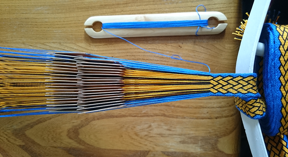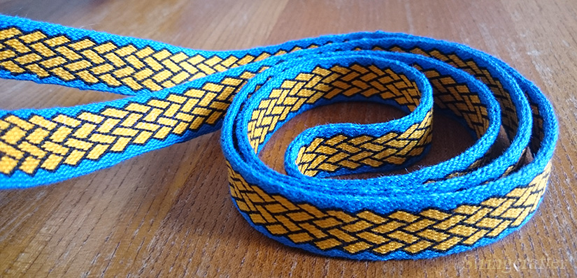 The width of the band depends on how firmly you pull/beat the weft. For smooth lines in the design, you’ll need to work to a much tighter tension than you normally would. The resulting band will be narrower and thicker than you’d perhaps expect for the number of cards used. Perfect for a belt!