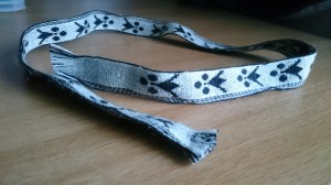 A wool warp and linen weft is in keeping with various tablet weaving finds, where the weft has disintegrated leaving the twined warp behind. The ermine points are not in keeping with a viking persona, but they are appropriate for Pelican regalia.