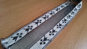 I checked width every cm while using a weighted beater every other row. I wasn’t as worried about beating the weft in hard, because this time I wanted to take advantage of tablet weaving’s tendency to elongate a pattern. The regular width checks kept the width variation to within 2-3mm, but there were still a lot of width “wobbles” within the 75cm.