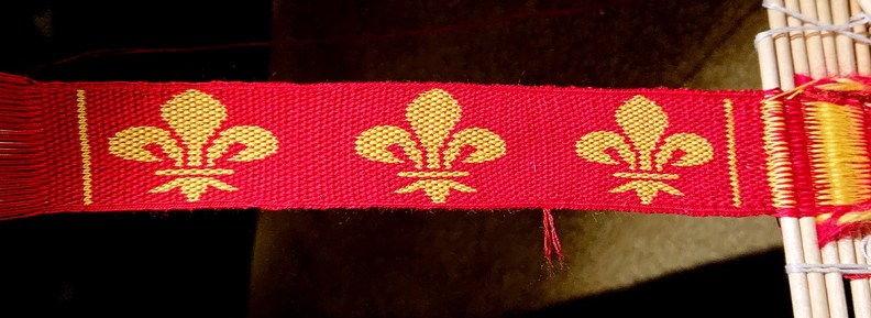 Each of the two motifs takes 48 cards total, so to achieve a suitable width, I used size 80 crochet cotton for the warp, in colours that reflected those of Antonio’s heraldry (arms). I chose thread that would be colourfast when washed, and stand up to wear and tear well. I used double strand standard sewing thread for weft.