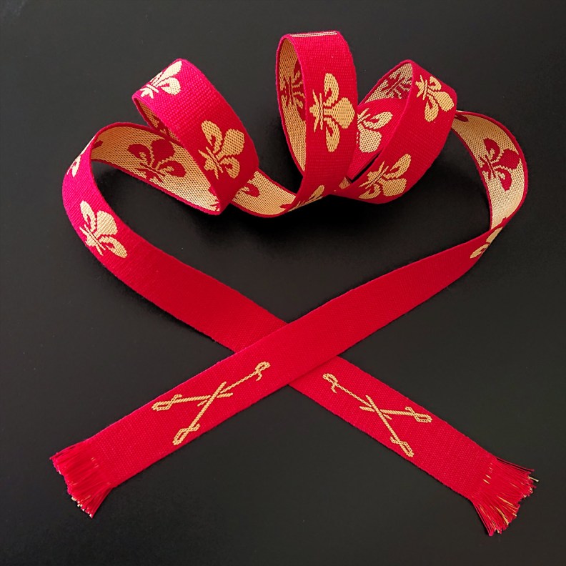 Antonio liked the idea of the garters having fleur-de-lis round the calf section, with a plain section dangling down, and finishing with the 3-sword motif about a cm above the metal tip. This was the same concept I used before for a gift for another MoD.