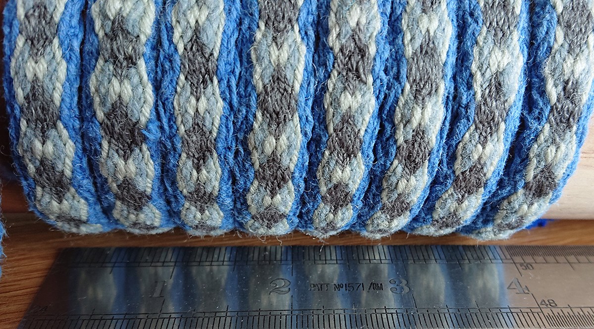 It’s a narrowish piece, about 12-13mm (half an inch) wide, and long enough to be a belt with a section hanging down. One end is sewn into a loop, and the other is finished in three plaits with what’s left of a tassel at the end of each plait. The plaits are 3 lengths, so the tassels hang on a diagonal. The band has blue borders, and white, grey and light blue threads in the pattern section of the band. The pattern is a simple threaded in diamond pattern, where the grey threads form the diamond.
